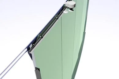 Presented with a blank sheet, the revised door was to be fast, quiet, and visually identical to the original. The unique steel cladding of the vertical frame elements was preserved while replacing the actual frame with lightweight aluminum. The five glass panels are suspended directly on a rolling carriage riding between curved, inclined rails attached to the ceiling along the original path between the ornaments. The door is driven by a compact servo motor and planetary gearbox using an industrial roller chain in a curved rack and pinion configuration. The resulting drive package is so compact it is hidden between ornaments on the exterior.